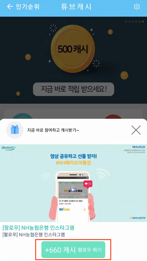 몇가지 설정을 앱에서 하라는대로만 하고, 유튜브 시청하시면 시청 시 마다 기본적으로 캐시가 적립되고,